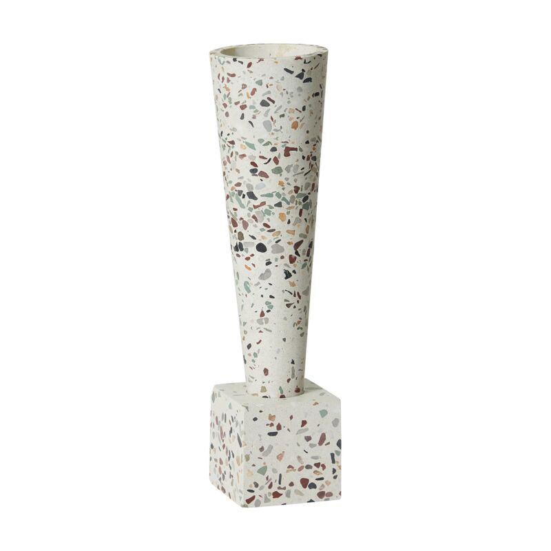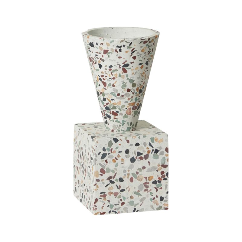 The Alexi Vase in trendy terrazzo also boasts a unique geometric base and cone shaped vase. Designed to be used as a small vase or planter, the Alexi Vase also fits a 2.5” drop in pot for all your designing needs.